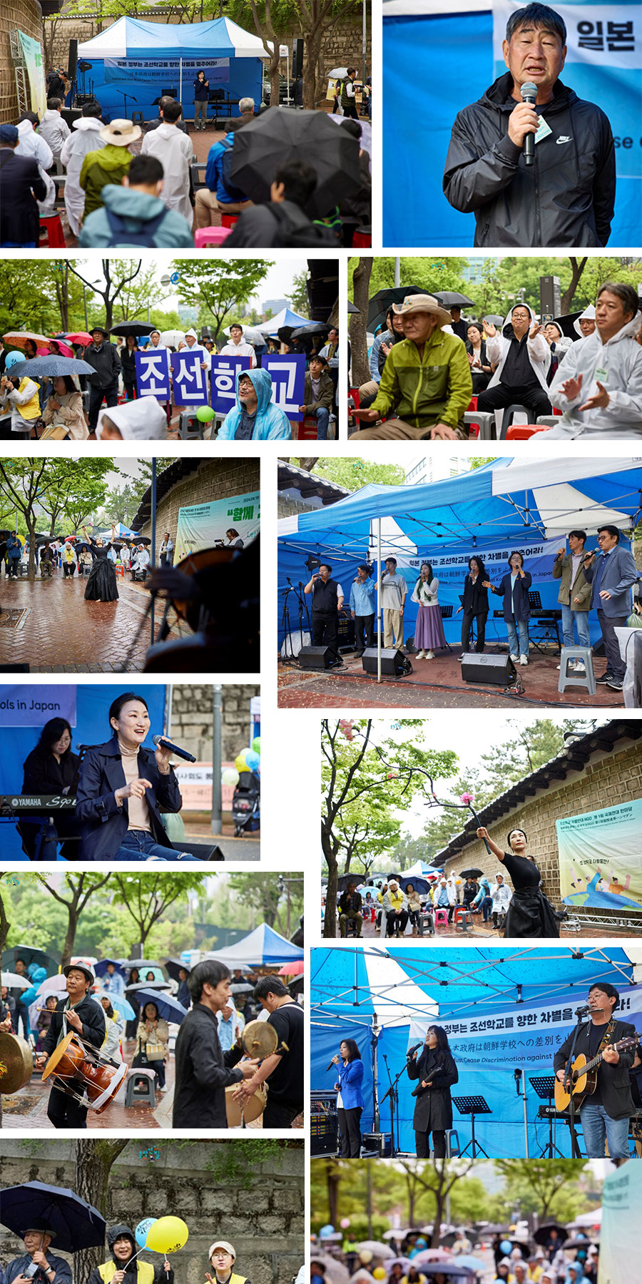 불행하게도 아침부터 저녁까지 비가 그치지 않아 보다 많은 시민들과 함께 할 기회를 놓쳐 아쉬웠습니다. 그러나 비오는 덕수궁 거리를 산책하는 시민들과 함께 조선학교 노래도 부르고 무용, 풍물패 공연 등 다채로운 무대를 통해 조선학교가 처한 현실을 전할 수 있었습니다. 오프닝 무대로 가수 이수진, 몽당연필 노래 소모임 ‘가그린’ , 그리고 부산에서 새벽부터 달려와준 풍물패와 하연화 춤꾼, 마지막 무대를 콘서트 처럼 멋지게 장식해 준 꽃다지까지. 그리고 우산을 쓰고 총총 지나가는 시민들의 걸음을 멈추게 한 각 단체 활동가들의 멋진 발언들. 마지막으로 ‘공동선언문’을 발표하고 행진을 준비했습니다.